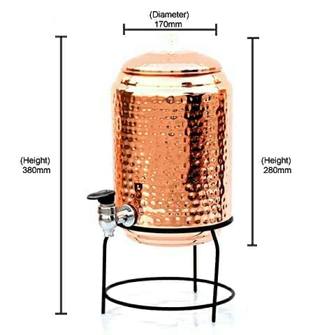 • Hammered Copper Pot/ Matka with Lid: Diameter - 16.76 cm, Height - 25.5 cm, Capacity - 5 Ltr, Matka Weight - 750 gm. • Glass: Diameter - 7.3 cm, Height - 9.5 cm, Capacity: 300 ml, Weight - 77 gm. • 5 Reason Why You Should Drink Water In Copper - 1. Help With Weight Loss 2. Keeps You Young 3. Helps Fight Enemia 4. Regulates Brain Function 5. Reduces Arthritis Pain. • Sufficient water storage for medium & big families • Material - Pure Copper • Cleaning Instructions:- Clean your copper ware by hand and avoid dishwasher. Use Pitambari powder to clean copper utensils and wipe with soft cotton cloth. • Number of Items 4(four).Write Your Review