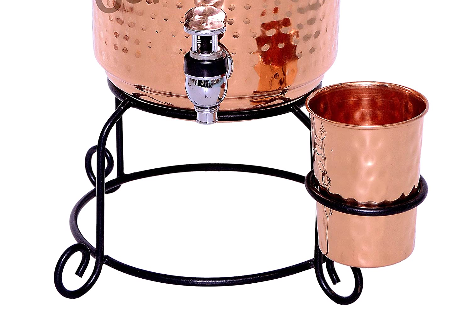 5 Litre Hammered Copper Water Dispenser/ Matka/ Pot/ Vessel (5000ml) with 2 Copper Glass (300Ml) and Iron Stand
