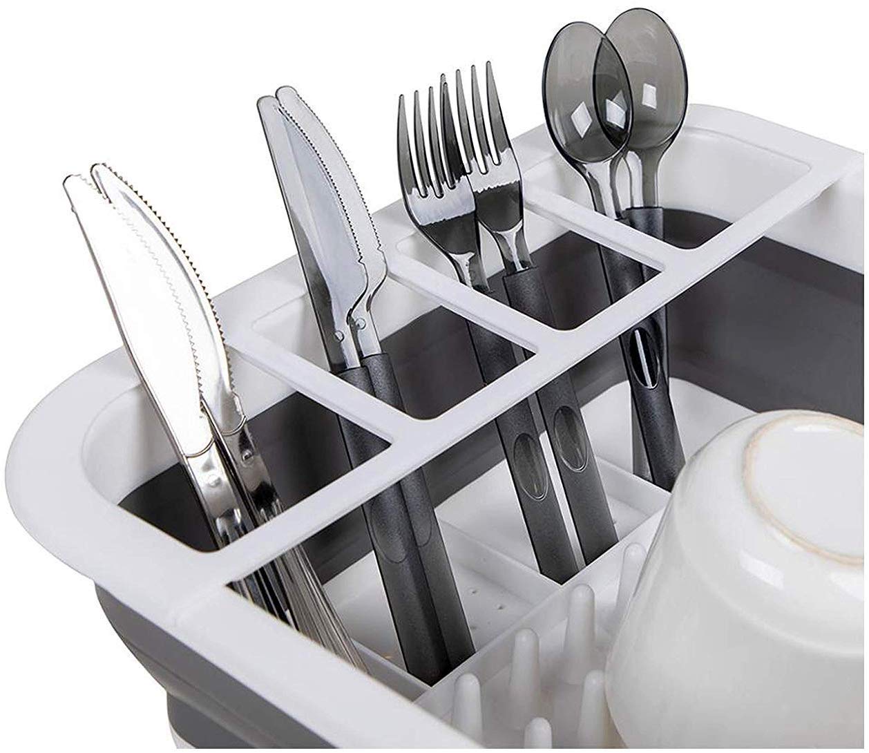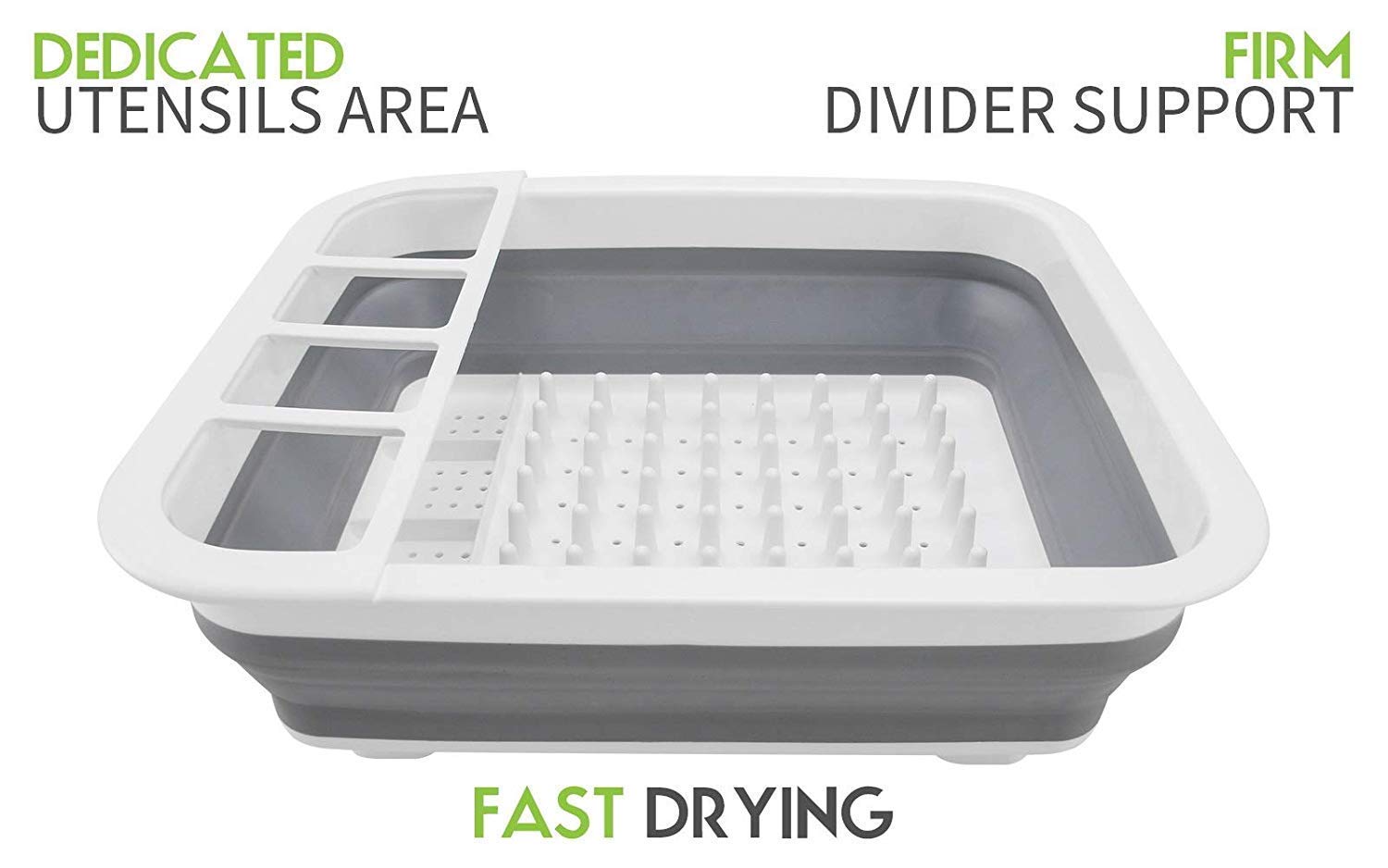 Collapsible Dish Rack stores and organizes dinnerware and glassware for air drying. Also has a separate area for drying silverware, gadgets, and kitchen tools. Flexible material allows dish rack to collapse flat for space-saving storage-making the most of your kitchen countertop or sink. Can be used with a drying mat or drain board.