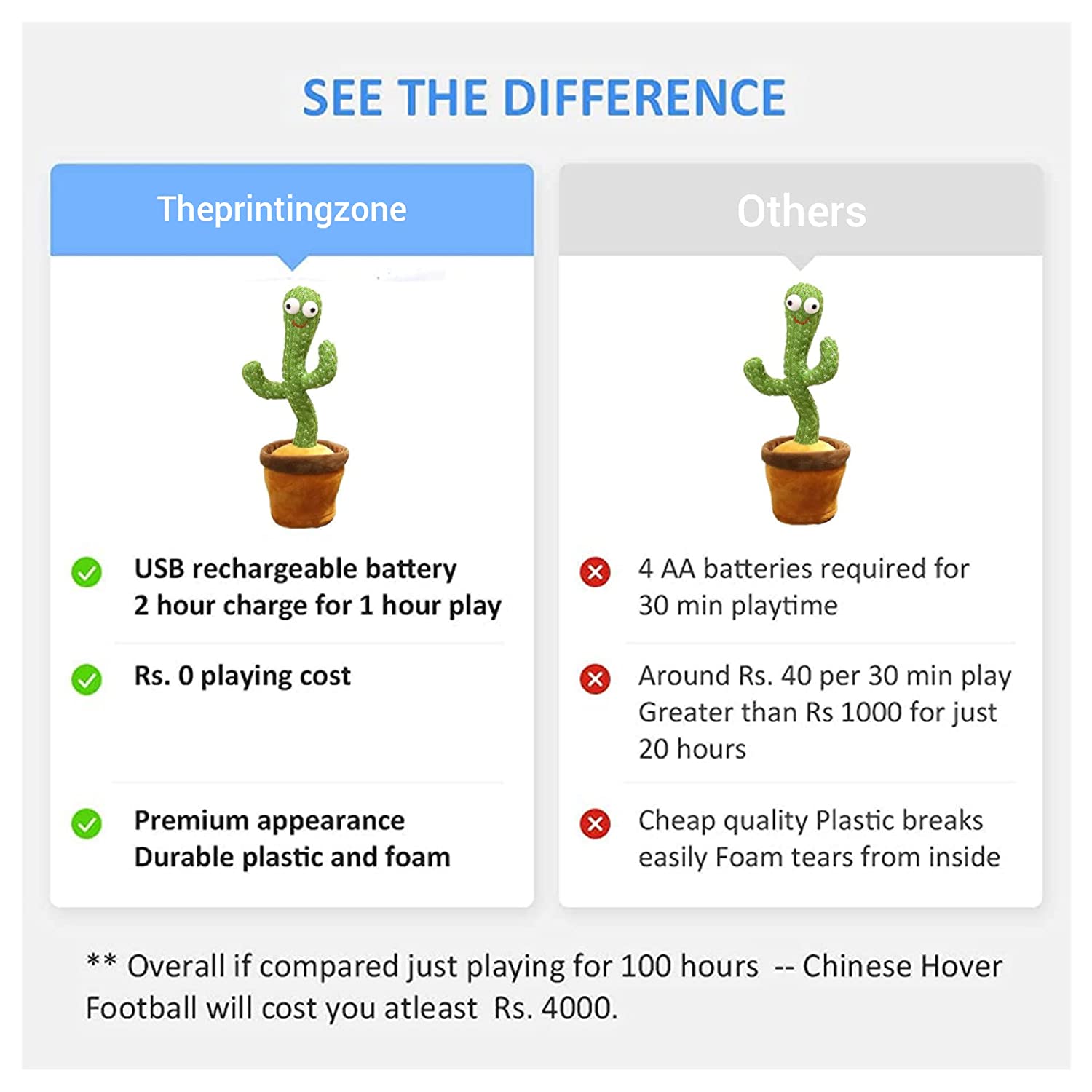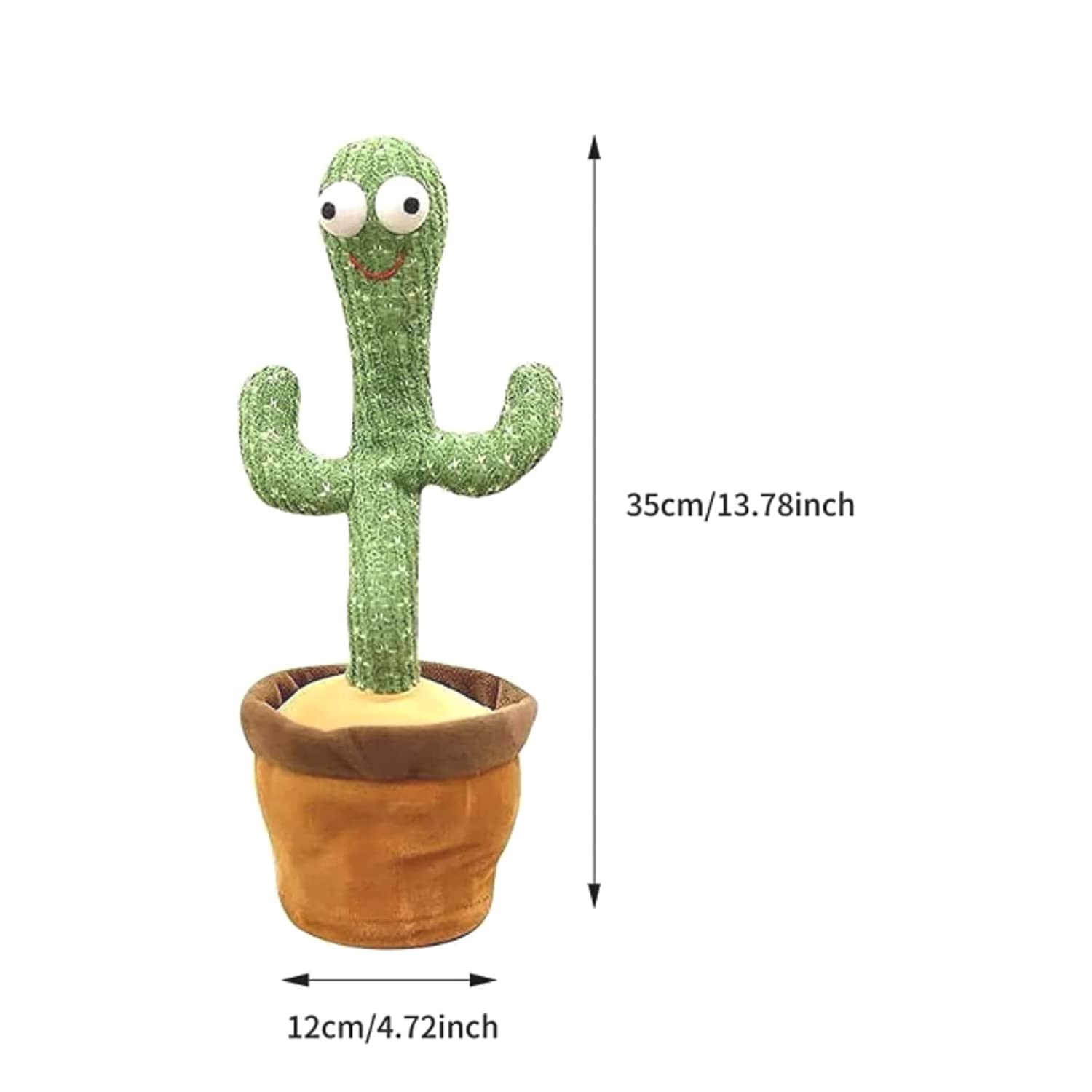 - Wide Circle dancing cactus toy is 12.6-inch height and 4.7 inch wide. It comes with a USB charging cable which can be used with any adapter, power bank or any other USB power source. So, it is hassle free to change batteries that pollute the environment.