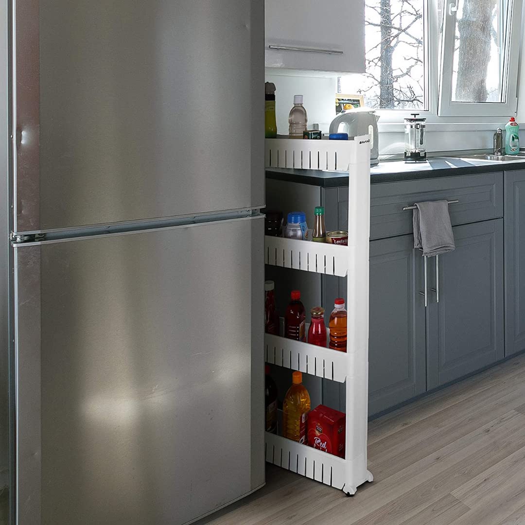 Easy to Move - Built-in removable wheels made this kitchen rack slides in/out easily between cabinets and appliances. Make your life easier and less cluttered with this convenient slide out storage tower, rack, cart cabinet.